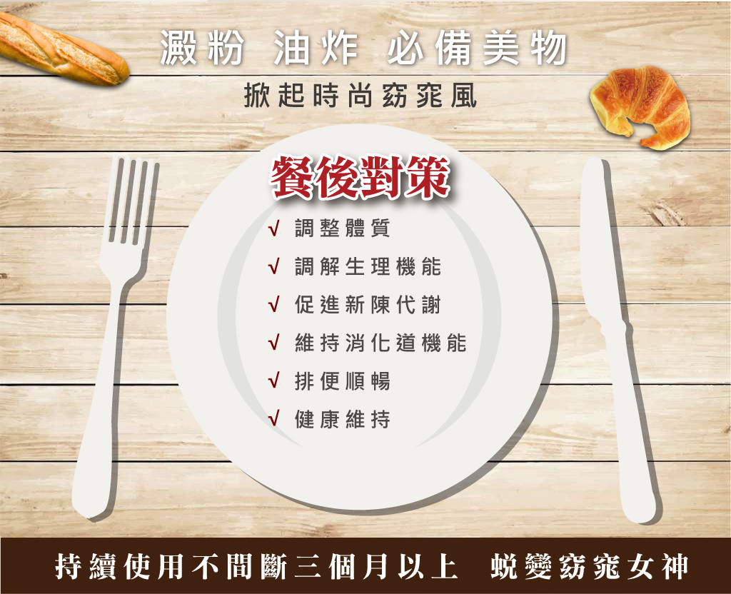 使用期間請保持正確飲食習慣,避免暴飲暴食、避免宵夜及大餐。