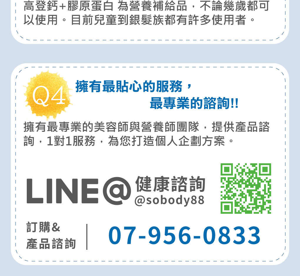 ※根據食品安全衛生法,廣告不得論及療效等字詞、如您想更進一步了解,可撥打產品諮詢電話07-956-0833,將有專業諮詢師與您一對一深入講解。