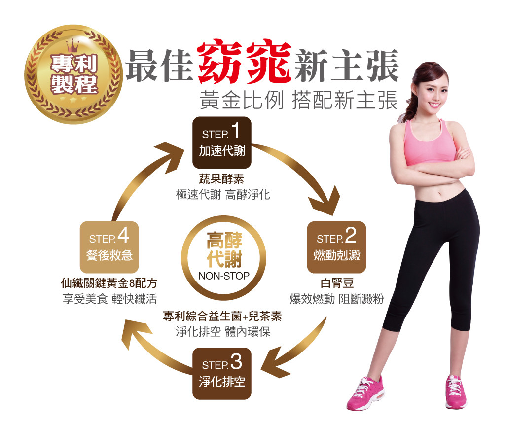 成 分:綜合蔬果酵素粉、專利綜合益生菌、綠茶萃取物、白腎豆萃取物、磷酸鈣、綜合蔬果抽出物、專利松樹皮萃取物、專利複合甘胺酸鋅、苦瓜萃取物(含專利胜肽)、神仙菜萃取物、專利非洲芒果種子萃取物、綠咖啡萃取物、苦橙萃取物、薑黃萃取粉、黑胡椒萃取物、啤酒酵母B群、海水抽出物(含鎂)